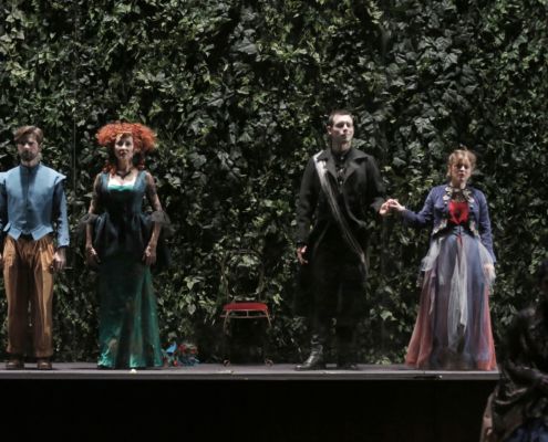 Sophie Tellier dans sa robe fourreau d’un vert éclatant, en rousse flamboyante, incarne avec beaucoup de conviction cette Flaminia manipulatrice à souhait. Sa sœur Lisette, son opposée, dans les traits d’Alexiane Torres à la voix grave, donne une touche d’exotisme avec sa robe aux couches de tissus impressionnantes et ses talons perchés : des costumes de Coline Ploquin très remarqués.