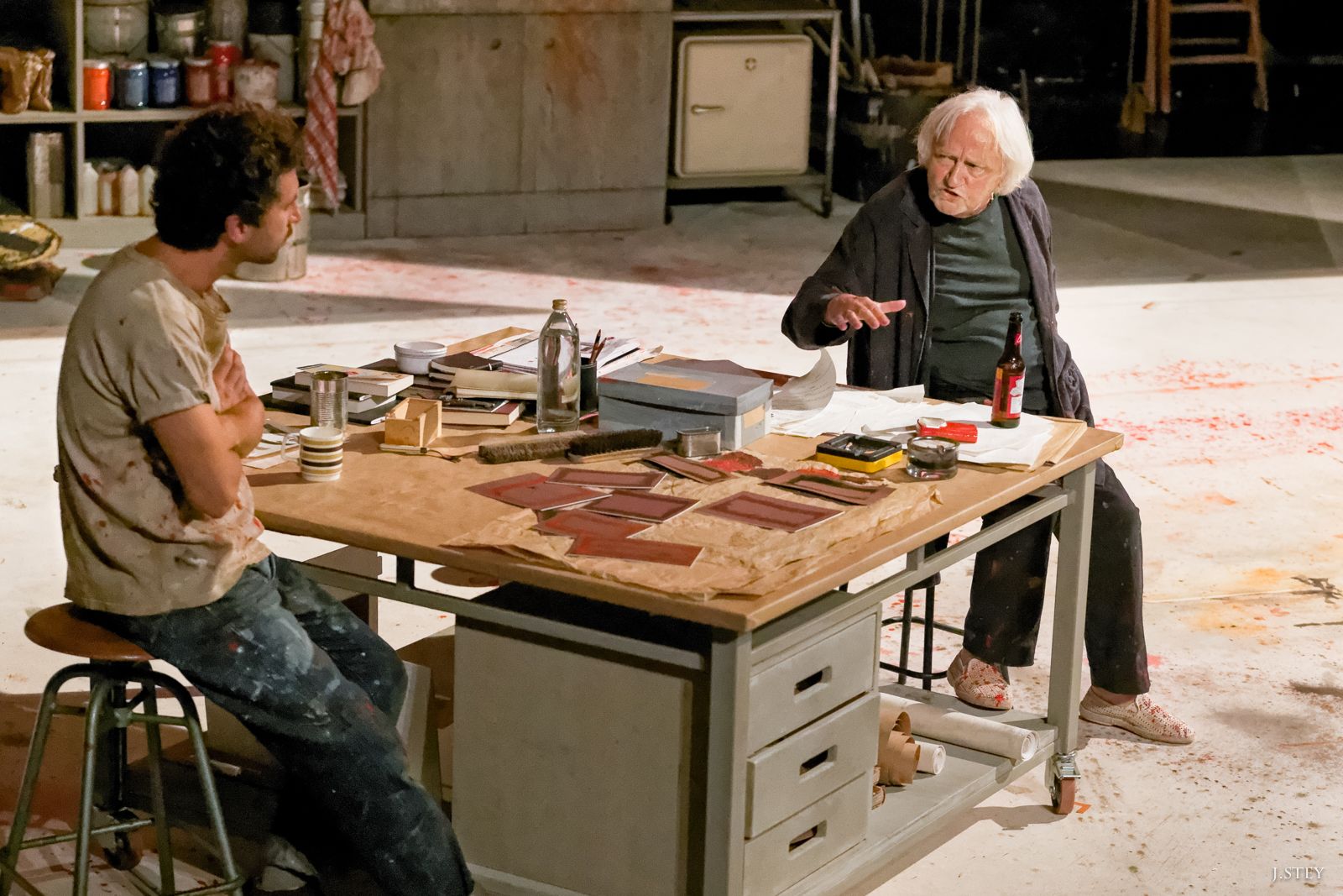 Le décor digne de Mark Rothko de Jacques Gabel, sous les lumières de Joël Hourbeigt, souligne la mise en scène de Jérémie Lippmann qui met en relief le côté anxiogène et irascible, la nonchalance de l’artiste toujours en mouvement, comme il veut que sa peinture soit, contrairement à la précision du geste du jeune Ken, pétrifié au début par tant de présence de l’Artiste aux multiples facettes très bien rendu par Niels Arestrup.
