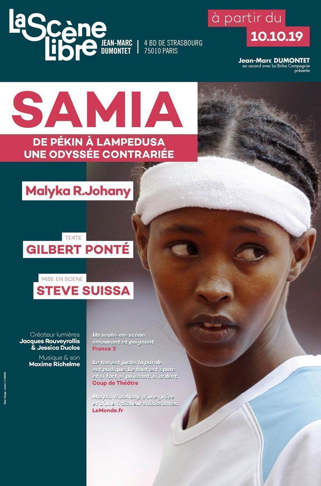 Malyka R. Johany incarne avec générosité et une très belle présence sur scène cette Samia aux valeurs humaines, à la passion cadenassée par le poids de la bêtise humaine, qui a risqué sa vie pour réaliser son rêve. Elle est tout simplement Samia. Son sourire éclaire avec bonheur cette nuit qui s’annonce dans la terreur, ses chants apportent de la joie, de l’émotion dans le cœur, le corps meurtri de cette sportive combattante et nous font oublier le temps d’un instant trop court les horreurs de la guerre, de son destin brisé.