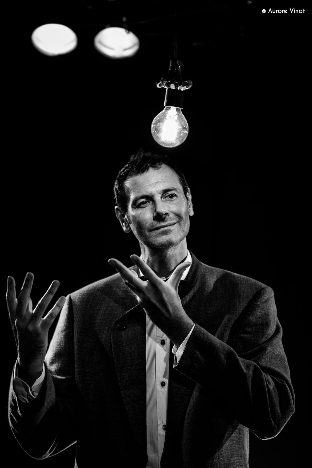 Celui qui m’a complètement séduit c’est Vincent Paillier à la palette de jeux très complète, il a une présence sur scène remarquable de justesse, de conviction. Un homme à la stature longiligne, qui est très à l’aise dans la peau des femmes, aux expressions, aux intonations et aux silences impressionnants. Il est à la fois tellement convaincant dans le rôle de la mère « Andrée » que dans celui du curé, qu’il en est désopilant. Il joue une vingtaine de personnages dans un rythme de changement hallucinant, rien ne lui échappe, rien n’est laissé au hasard, il les maîtrise jusqu’au bout des doigts : une performance de comédien à souligner.