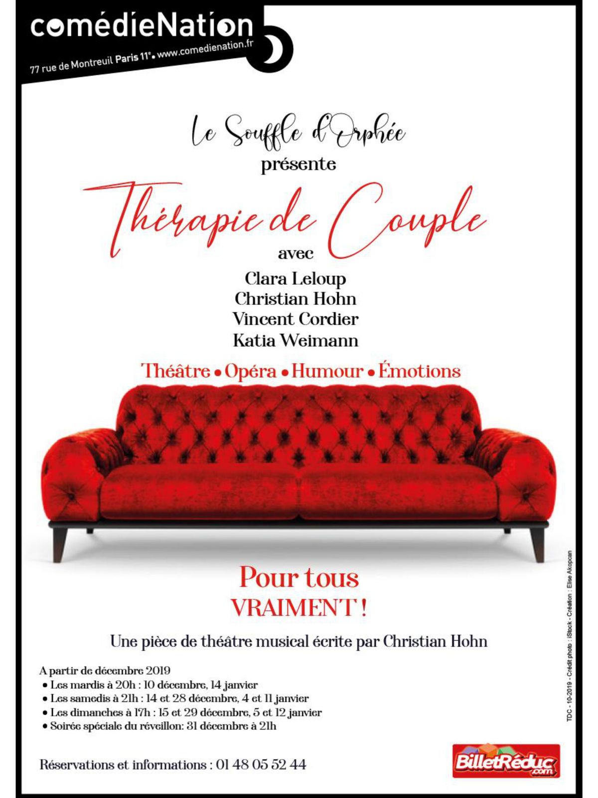 « Thérapie de couple » à la Comédie Nation, jusqu’au 14 janvier suivant calendrier. Réveillon du 31 décembre à 21h avec une coupe de champagne.