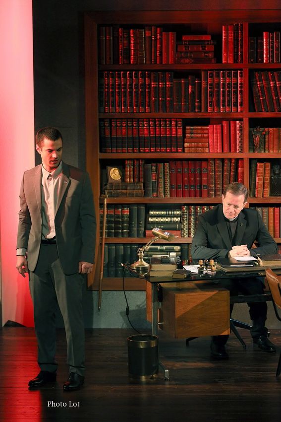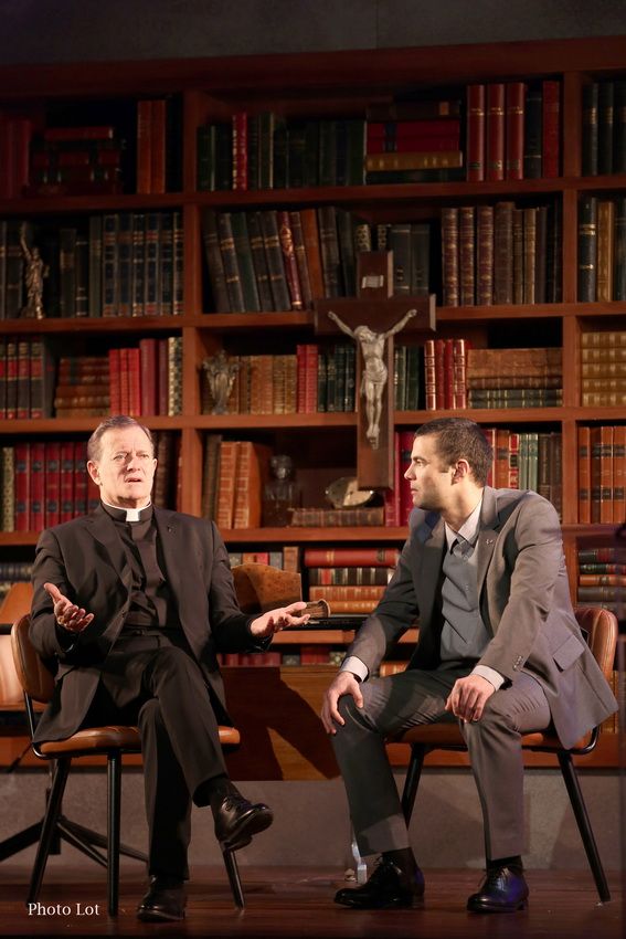 Je n’avais pas vu la première version de « L’affrontement » dans l’adaptation de Jean et Dominique Piat en 1996, mais celle avec Francis Huster et Davy Sardou le 24 janvier 2014 au Rive gauche. Il m’en restait un très bon souvenir et je voulais voir cette nouvelle traduction de Davy Sardou y apportant une touche de valeurs actuelles ; et qui est remplacé dans son rôle du jeune séminariste par Valentin de Carbonnières, que j’avais beaucoup apprécié dans « 7 morts sur ordonnance » (Cliquez) dans ce même théâtre qui le couronna d’un Molière. Un Davy Sardou qui « maîtrise » la pensée, l’écriture de Bill C. Davis, lui qui interpréta également une autre pièce de l’auteur : « Les vœux du cœur » au théâtre La Bruyère. Une continuité dans la vie de l’église avec deux jeunes homosexuels qui souhaitent se marier.