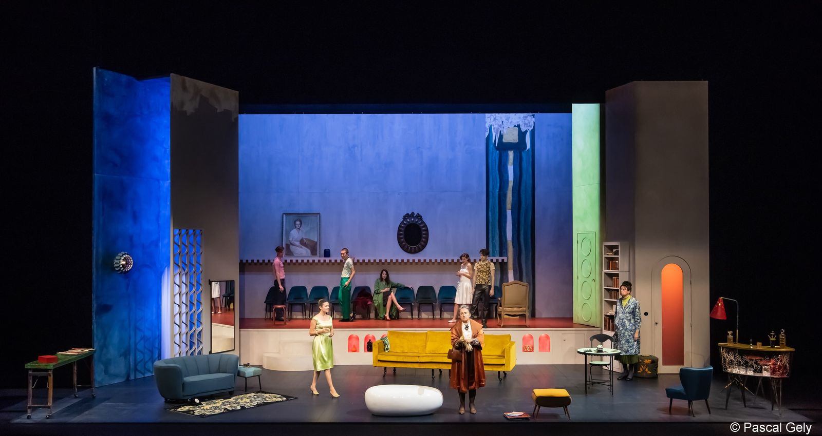 Macha Makéïeff a transposé l’intrigue dans les années 50, dont le propos de Molière est intemporel pour y voir possiblement une actualité brûlante, avec son décorum approprié. L’explosion des couleurs acidulées des costumes dont elle a le secret, où le vert n’a pas à rougir de sa présence, et où les chaussettes sont absentes pour les hommes, les ancrant davantage sur le sol pour une réflexion murie, à l’exception d’Orgon dont sa position navigue entre deux eaux, est au service d’un décor bourgeois laissant paraître l’aisance d’un Orgon à la cassette de l’avare. Une cassette convoitée par un Tartuffe qui normalement n’apparaît qu’au troisième acte, mais qui dans cette version laisse présager avec son introduction dans un prologue très proche d’une vision d’une secte entourée de ses adeptes, une farce à la noirceur établie. Nous en aurons la confirmation avec la scène fantastique d’une messe noire impressionnante, volent les corbeaux, volent…