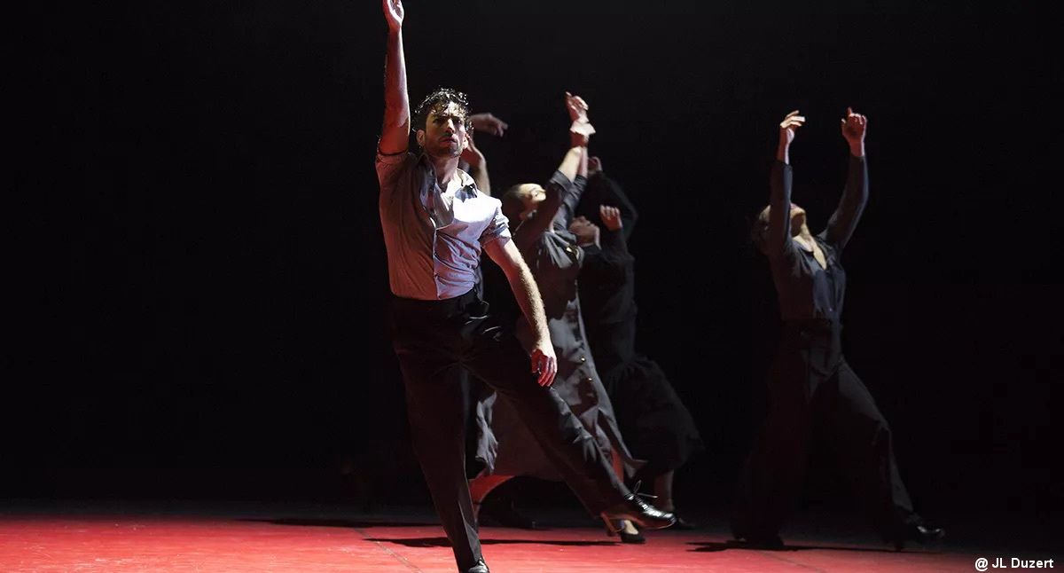 Dans un travail des lumières remarquable de Gloria Montesinos AAI, la testostérone marque de son empreinte les coups de talon de David Coria au milieu de ses danseurs, dont on se demande comment ils arrivent à frapper aussi vite leurs pointes – talons en prolongement du chant des castagnettes. Les mouchoirs quant à eux tournoient pour cacher les visages de ces couples qui se cherchent.