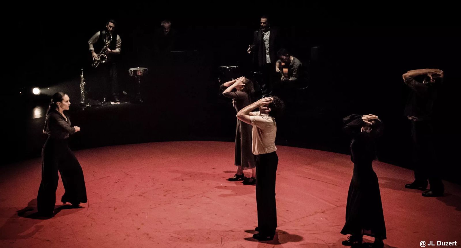 Un noir qui se fait très lentement dans la salle, libérant quelques notes de musique, prémices d’un flamenco naissant. Deux traits lumineux lèchent le rideau de scène s’ouvrant sur un cercle rouge, lieu scénique théâtral, où des pas vont jaillir aux sons de talons bien rythmés, frappant amoureusement le sol, ne laissant aucun droit à l’erreur, évitant ainsi la catastrophique fausse note.
