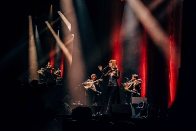 Dans une atmosphère feutrée où les projecteurs, dans une lumière rasante, éclairent les pendrillons tout de noir vêtus, trois praticables attendent leurs musiciens. L’émotion est au rendez-vous, le silence envahit la salle, les musiciens prennent place, glissent leurs doigts habiles sur les cordes, puis la magie opère. Katia Guerreiro a cappella entre sur scène dans sa robe longue d’un noir étincelant. D’une voix chaude, profonde, elle nous embarque dans son histoire, celle du fado.