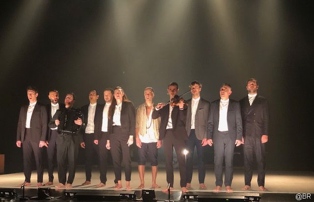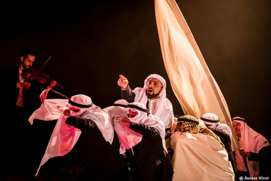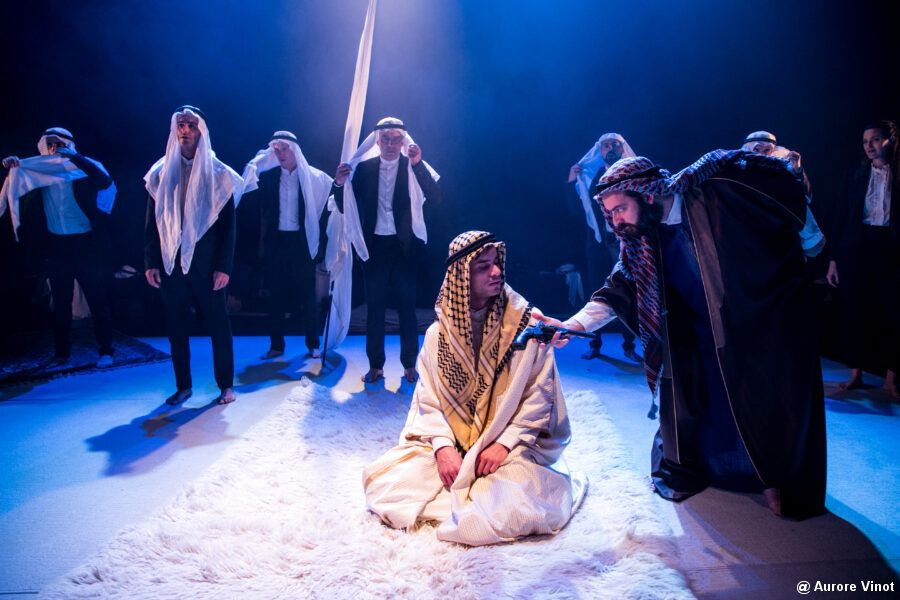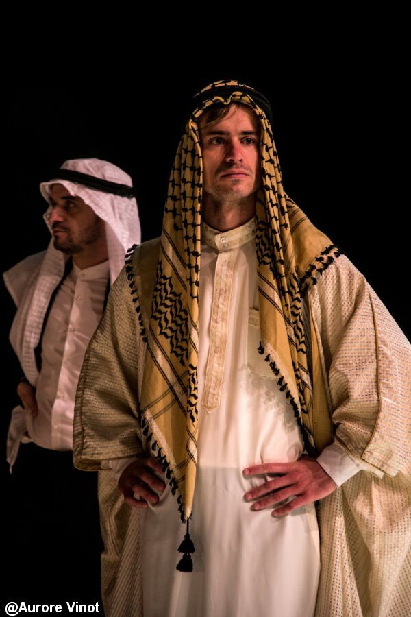 Alexandre Blazy au regard impressionnant, Matias Chebel à la détermination sans faille, Stefan Godin à la présence imposante, Yoann Parize et Julien Saada aux jeux habiles, viennent entourer Lawrence dans sa quête d’un idéal malmené. Mais aussi rien ne serait possible dans cette extraordinaire aventure sans Julien Gonzales (que j’ai plaisir à suivre dans ses prestations très variées) aux percussions et à l’accordéon, et Raphaël Maillet au violon dont l’archet virevolte au milieu de ce tumulte. Ils accompagnent la sublime voix de Cecilia Meltzer qui nous a aussi ensorcelés avec sa danse du ventre. Une troupe au diapason habillée avec un éblouissant florilège de costumes de Nadège Bulfay qui contribuent au succès de cette histoire vraie.