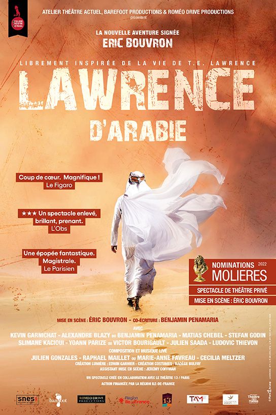 « Lawrence d’Arabie » sur la scène du théâtre La gare du midi à Biarritz, le 07 janvier 2023, un évènement Entractes Organisations. Prochaines représentations : le 20 janvier à Miramas, le 26 janvier à Cambrai, le 27 janvier à Clichy, le 28 janvier à Poissy, en tournée jusqu’en juin.