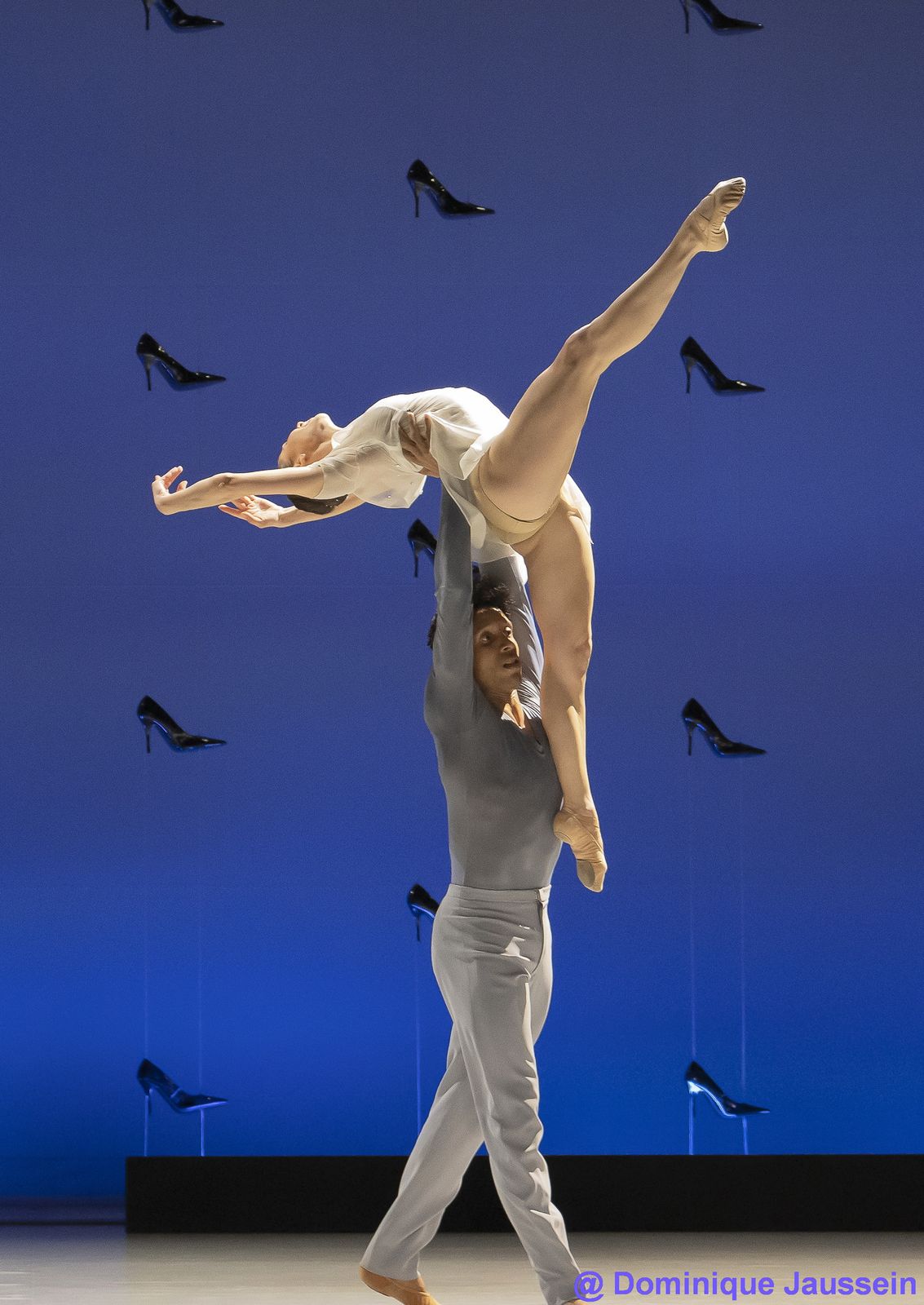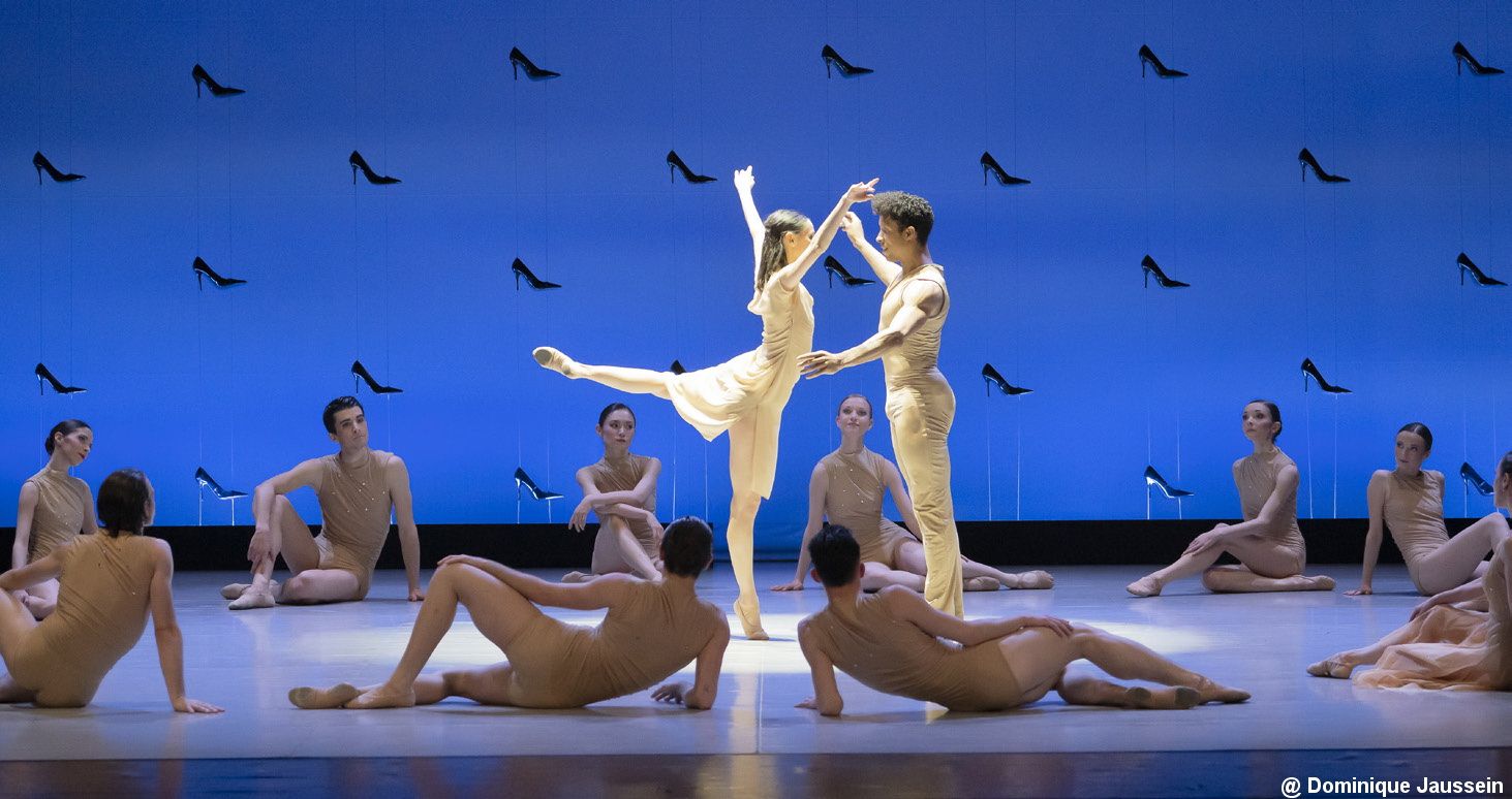 Dans une scénographie de Jorge Gallardo des plus épurées, les danseurs sont encadrés dans leurs évolutions par des murs aux lignes remplies d’escarpins rutilants.