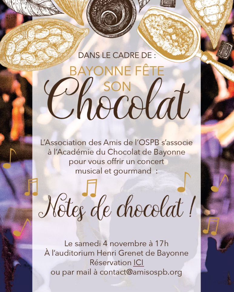 Un concert chocolaté composé de six recettes dans lesquelles chaque chocolatier de Bayonne a exprimé le temps de quelques envolées, quelques notes, les saveurs qui reflètent leur savoir-faire. Ils seront associés aux pièces musicales avec une douceur en chocolat à déguster au moment de l’interprétation pour en ressentir tous les bienfaits. Des parfums poivrés, vanillés, associés à une saveur croustillante où des notes de fruits secs venaient se joindre à une texture qui tenait en bouche dans une longueur qui évoque des contrées lointaines comme le Pérou ou encore Haïti.